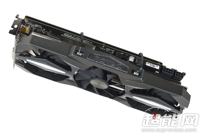其實(shí)鏤空處配合上兩側(cè)小凹槽可以安裝兩個(gè)小風(fēng)扇(隨顯卡標(biāo)配一個(gè),另一個(gè)為選配),可以針對(duì)GPU和Mos管位置的PCB進(jìn)行有效散熱,這就是索泰首創(chuàng)的“3D-Storm立體散熱引擎”。兩個(gè)小風(fēng)扇供電位置在ZOTAC LOGO兩旁,但是突兀的風(fēng)扇電源線顯得有些違和,設(shè)計(jì)上應(yīng)該可以更進(jìn)一步,如果能做到XFX的可拆卸觸點(diǎn)式設(shè)計(jì)就更好了,既美觀又便捷。