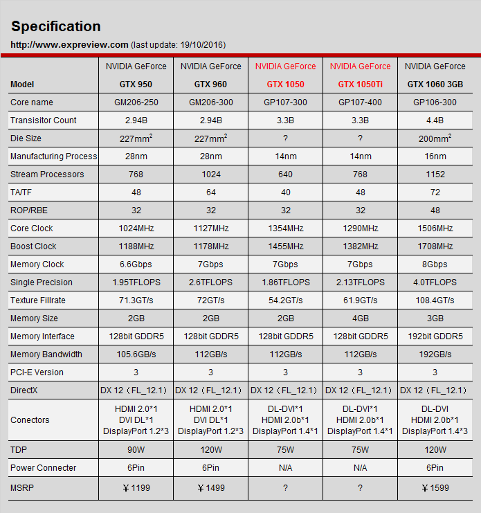 GTX 1050和GTX 1050 Ti目前已知的參數(shù)對比整理如下圖。