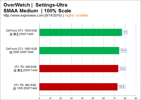 《守望先鋒》里開啟DSR與VSR幀數(shù)都會比原生分辨率要低,GTX 1060開啟DSR的降幅明顯一點,不過也在4%之內(nèi)。