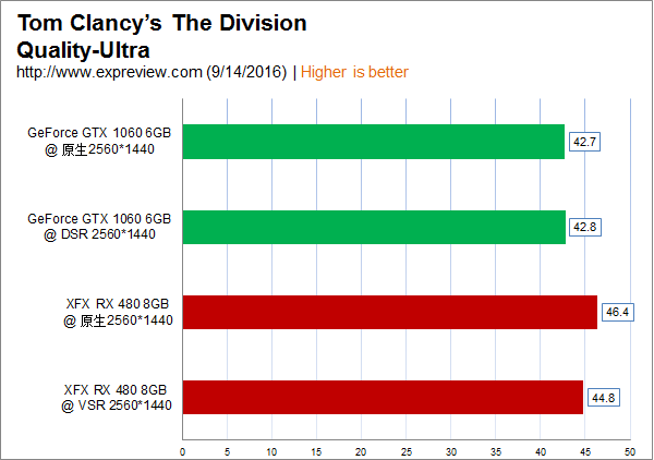 《全境封鎖》游戲里面GTX 1060開啟DSR 2K分辨率其實和原生2K分辨率沒啥差距,而RX 480開啟VSR 2K分辨率則會比原生2K分辨率低一些,幀數(shù)降幅在4%之內(nèi)。