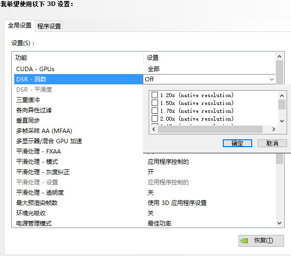 NVIDIA的DSR在驅(qū)動的控制面板中可以開啟,在“管理3D設置”選項內(nèi)可開啟,而且還有多個放大因數(shù)可以選擇,顯示器最大分辨率乘以這個因素就是對應的分辨率。