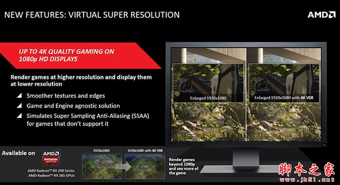而AMD的VSR(Visual Super Resolution)視覺超分辨率技術實際上也是差不多的東西,都是把每一幀圖像按照2K或者4K的分辨率渲染,在以1080p分辨率的方式輸出到顯示器上,以此達到讓圖像細節(jié)和抗鋸齒表現(xiàn)更好的效果。