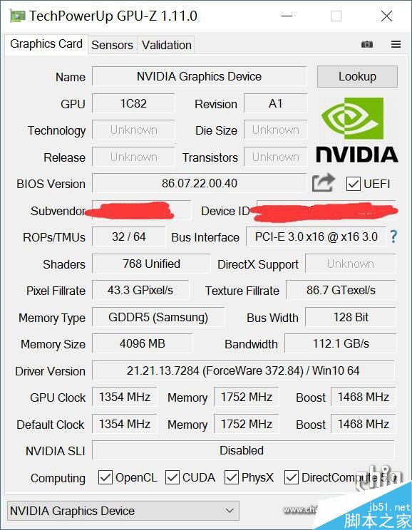 因為沒有正式驅動,工廠測試版下,GPU-Z未識別,規格方面,包括768個流處理器,32個光柵單元,64個紋理單元,GP107核心頻率基礎1354MHz、加速1468MHz,同時搭配128-bit 4GB GDDR5顯存。