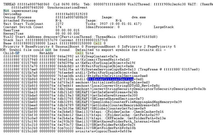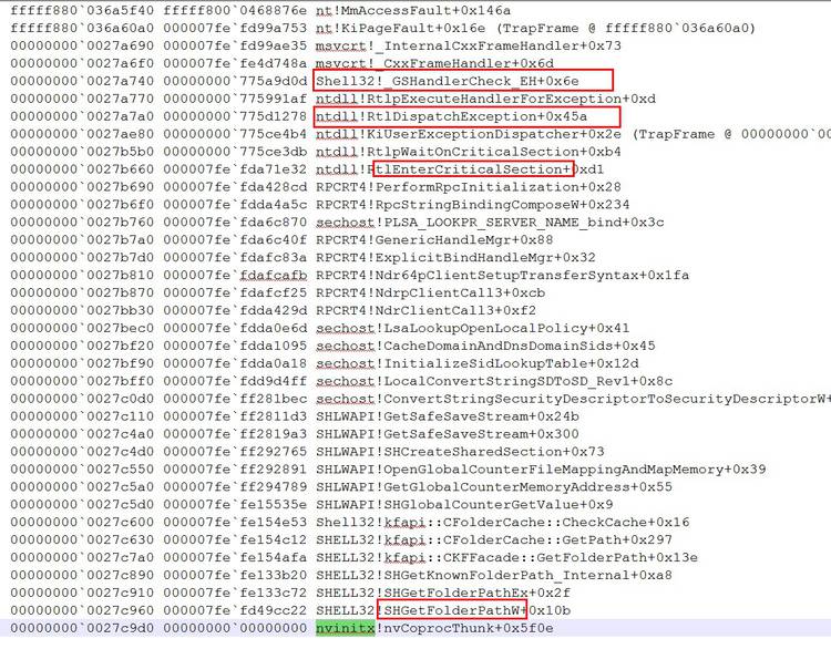 (上雙機調試)調試發現dwm.exe的主線程中英偉達nvinitx.dll的dllmain會調用SHGetFoldPathW函數,這個函數調用的時候,已經占用了鎖SddlSidLookupCritical,這個時候在去調用RPCRT4.dll中相關函數,卻在調用EnterCriticalSection獲取rpcrt4的臨界區GlobalMutex出現異常,跳出到shell32中的異常處理函數_GSHandlerCheck_EH,這個時候導致沒有釋放SddlSidLookupCritical鎖,SHGetFoldPathW就返回了。查看了下異常,發現rpcrt4中的臨界區該臨界區GlobalMutex沒有初始化,dllmain 內部很多其它變量值也沒有初始化,可以確定是dllmain沒有被調用到。