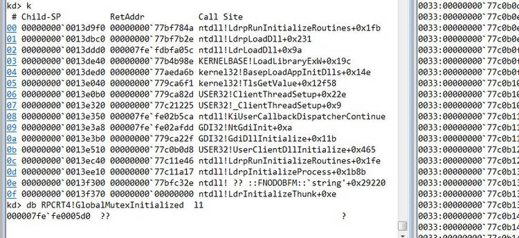 Loadlibrary調用LdrpLoadDll(這個函數先檢查模塊rpcr4.dll是否映射,發現已經映射就不會調用這個的dllmain,接下來調用其它函數使用臨界區GlobalMutex就出現異常崩潰)這個rpcr4.dll的dllmain會在接下來的ntdll!LdrpRunInitalizeroutines函數內部調用 。