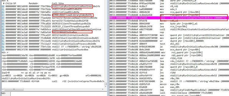 這個出問題環境調試發現rpcr4.dll中dllmain并沒有調用到,這個時候gdi32的dllmain函數內部調用loadlibrary加載nvinitx.dll,并調用nvinitx.dll的dllmain函數,但是這個時候調用LdrpLoadDll加載rpcr4.dll的時候,(之前剛映射,這個時候LdrpLoadDll發現rpcr4.dll已經被映射了,所以就不會調用這個rpcr4.dll的dllmain函數)
