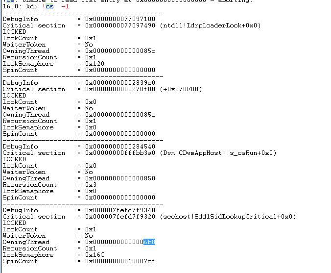 3. 查看鎖sechost!SddlSidLookupCritical的狀態,發現此鎖被dwm.exe主線程占用,沒有釋放。 仔細分析發現主線程正常情況下不應該釋放不了這個臨界區。