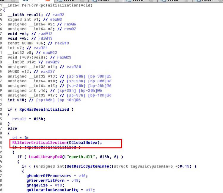 5. ida分析可以知道GlobalMutex的初始化在rpcrt4.dll的dllmain內部 。所以可以知道出問題的原因就是rpcrt4.dll的dllmain沒有調用到,那么為什么會導致這個dllmain沒有調用掉呢?