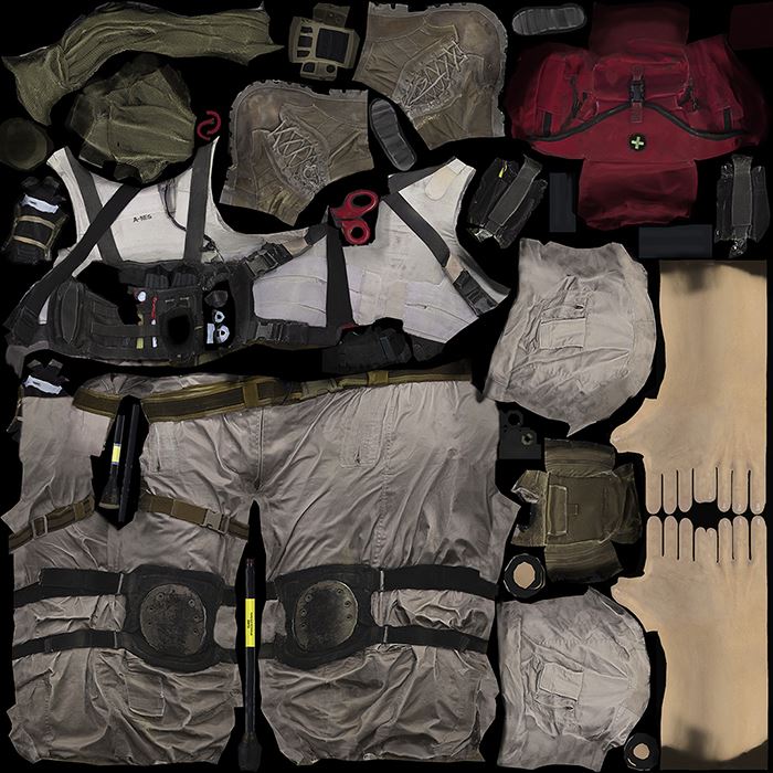 同樣在Crysis3中的男配角,人物模型使用了1.5萬(wàn)三角形,10張分辨率2048*2048,5張分辨率1024*1024的紋理貼圖。