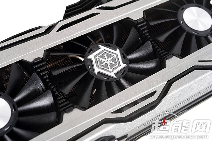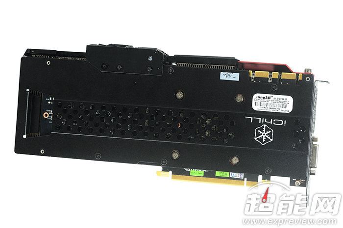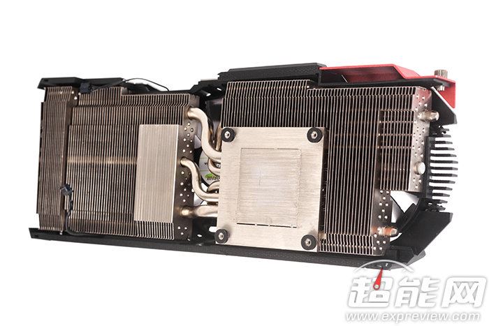 GTX 1080冰龍超級版的散熱器規模由正面的三個92mm和頂部一個50mm的15葉風扇組成,中央的風扇主要負責GPU核心熱量的排放,位于左右兩邊的風扇負責GPU供電和其他部分的熱量排放,而頂部的風扇本質上是為了加強顯存和供電模塊的熱量排放而設計的。紅色的金屬遮罩主要是為了保護SLI金手指,除了保護作用在外觀上和散熱器整體也顯得渾然一體,玩家需要組建雙卡的時候,需要用內六角螺絲刀拆除。