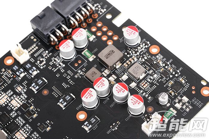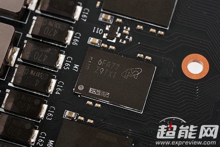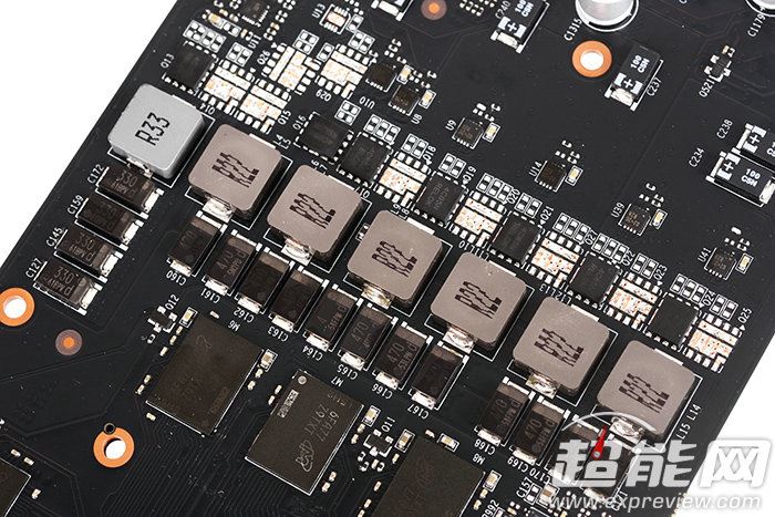 GTX 1080冰龍超級版的PCB雖然和公版一致,但是在用料方面更好,可以看到,在GTX 1080公版只有5+1相供電的基礎上,冰龍超級版補全了公版PCB空焊位的相數,達到了6+1相,其中GPU核心為6相供電,顯存部分為1相供電。