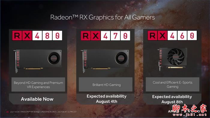 目前Polaris家族顯卡中,RX 480已經上市,RX 470、RX 460今天算是正式發布,不過二者分別要到8月4日、8月8日才能解禁,性能測試及正式報價也會在那兩天揭曉。