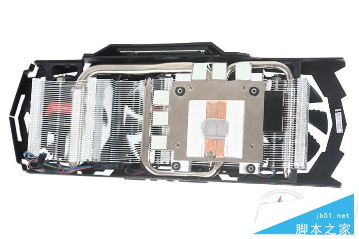 看完了外觀下面我們就來看看這塊顯卡的用料方面,先把散熱器拆開,我們可以看到雙熱管貫穿整個散熱器,與GPC核心接觸的方式是熱管直觸。