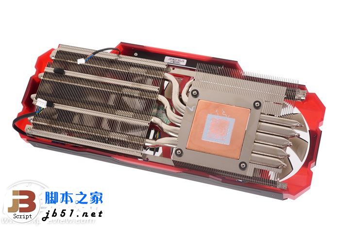 這次耕升對蓋亞散熱器進行了升級改造,從原來的3熱管升級到1根6mm+4根8mm共5根熱管,并且散熱風扇也從原來的兩個10CM升級到三個9CM,這三個風扇在測試時滿載大約1400RPM,而它的等效散熱功率提高到300W。