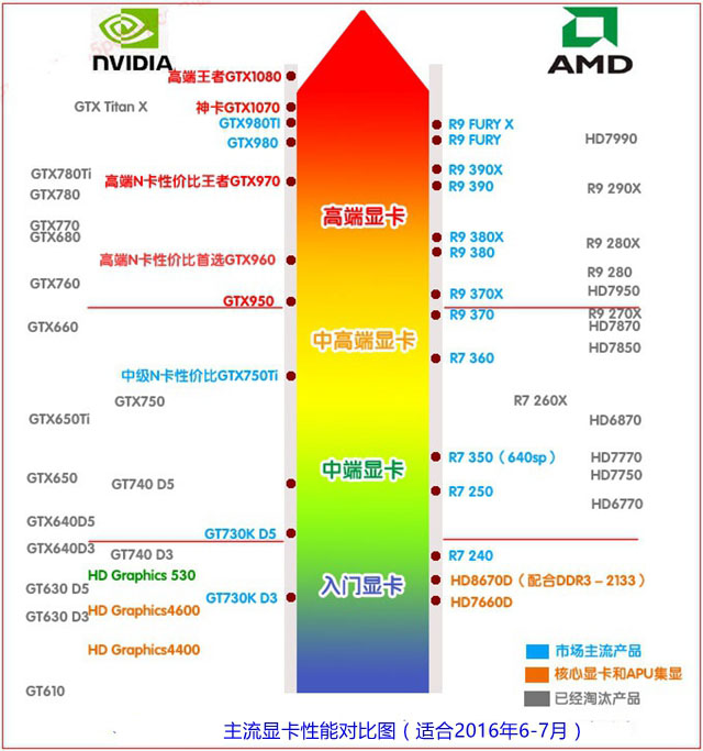 相信從這張顯卡天梯圖2016年6月最新版,要快速了解到顯卡大致性能定位久非常簡單了,性能越強,其排名就越靠上。