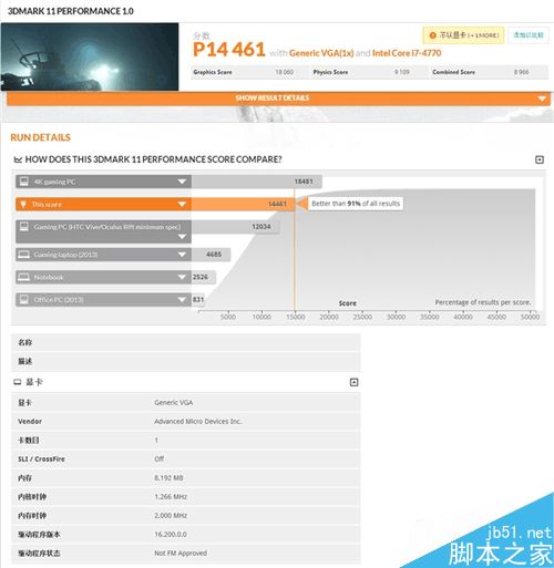 i7-4770+AMD RX 480平臺測試,該顯卡在3DMark 11中跑分為P14461分,相當不俗,相比GTX 970顯卡大概高出了2500分,GTX970可是NVIDIA推薦的VR虛擬現實系統入門顯卡,AMD也一再強調RX 480的使命就是普及VR,看來肯定做到了。