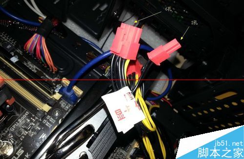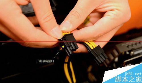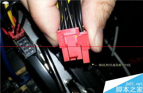 3. 如果顯卡上所帶的供電插口是8孔的,我們需要將顯卡供電線接頭上的6孔和旁邊的2孔組合起來(lái),組成一個(gè)8孔接頭