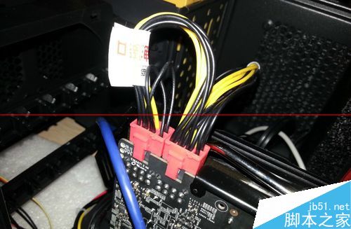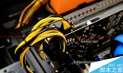 4. 將拆開的一個(gè)6孔顯卡供電插頭插入顯卡上的接口中,按緊;并將剩余的插頭整理好,以免影響機(jī)器內(nèi)部整潔和美觀;