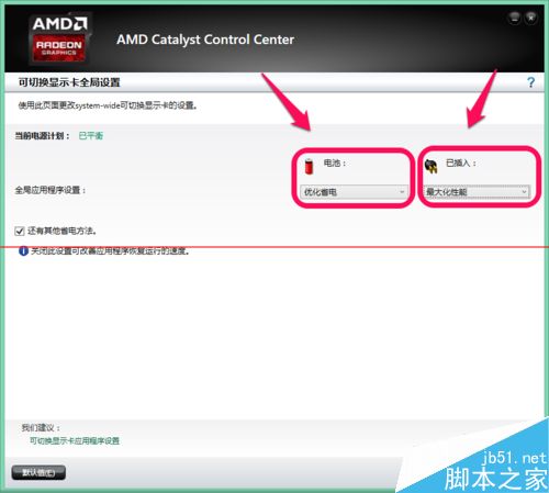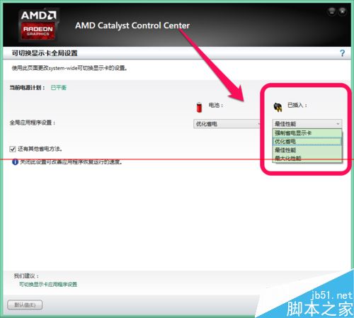 5、如果覺(jué)得一個(gè)一個(gè)選擇程序太麻煩可以點(diǎn)擊”切換顯卡全局設(shè)置“來(lái)設(shè)置所有程序使用的顯卡,”電池“對(duì)應(yīng)沒(méi)有插電源的情況,”已插入“對(duì)應(yīng)插入電源的情況,下拉選項(xiàng)中選擇要設(shè)置的顯卡,
