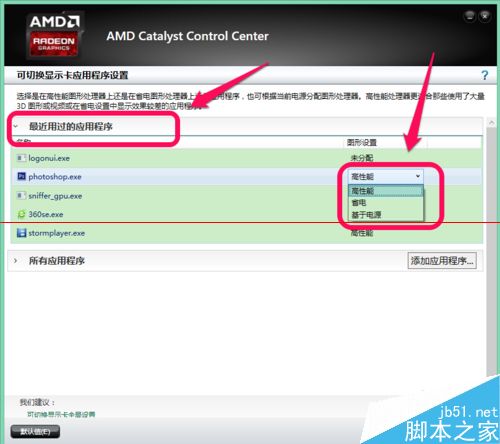 2、點(diǎn)擊后會(huì)看到顯卡的配置界面,在“最近用過(guò)的應(yīng)有程序”中可以看到最近使用的軟件,程序右邊的是圖形設(shè)置可以設(shè)置程序使用的顯卡,“高性能”是使用獨(dú)立顯卡,“省電”使用獨(dú)立顯卡,基于電源是讓電腦自己根據(jù)電源選擇