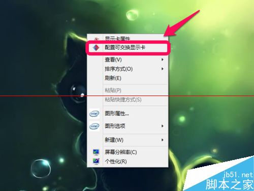 1、如果筆記本驅(qū)動(dòng)安裝正常,在桌面右擊會(huì)出現(xiàn)“配置可交換顯卡”的選項(xiàng),左擊進(jìn)入設(shè)置(如果沒(méi)這個(gè)選項(xiàng)有可能驅(qū)動(dòng)沒(méi)有安裝正確,到官網(wǎng)下載對(duì)應(yīng)的驅(qū)動(dòng))