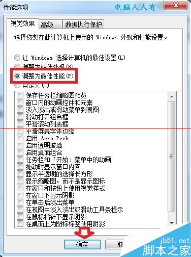 3、性能選項→視覺效果→調整為最佳性能→確定