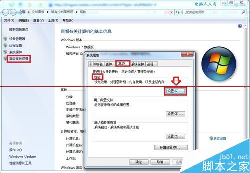 2、知道緣由之后,如果配置的確不太高,可以盡量關閉華麗的視覺效果。開始→控制面板→系統→高級系統設置→高級→性能→設置