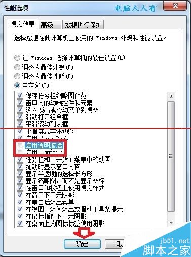 4、如果之后一段時間操作系統恢復正常了,還可以選擇 調整為最佳外觀 之后再關閉 啟用透明玻璃 和 啟用桌面組合 兩個選項→確定。