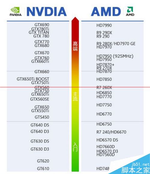 5、之前AMD顯卡正處于Radeon HD 7xxxx一代,現在又推出了R9系列,而且NVIDIA顯卡處于GTX6xx、GTX7xx,在此我總結了一個規律,在HD和GTX之后的第一位數字一般表示產品的設計架構,第二位數字表示產品的定位,大家可以看最上面的GTX690和最下面GT610都是6系列的,但是9代表定位為高端發燒級,而1代表定位為入門級,雖然這個規律不能一概而論,但是對于一般看不懂顯卡參數的朋友還是能起到幫助的,但是這個不能對不同系列來看,比如AMD的7xxxx和R9