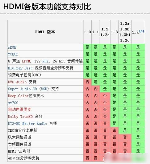 HDMI高清接口各版本功能支持對比