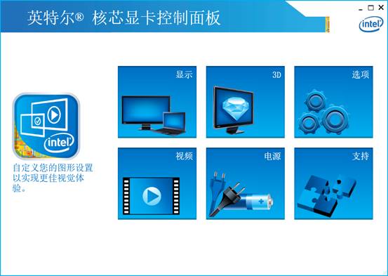 打開圖形屬性,最新版英特爾核心顯卡控制面板分為六大區(qū)域,顯示、3D、選項(xiàng)、視頻、電源、支持,如圖: