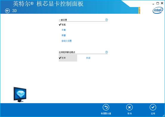 2. 3D界面,里面有一般設(shè)置和應(yīng)用程序最佳模式,可以選擇,如圖: