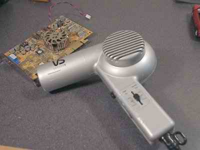 我們要用到的第一樣工具是非常普遍的電吹風。把電吹風設置為熱,然后對著粘住GPU的散熱片加熱。我們要把它加熱到一定的程度,注意也不能太熱,在感到燙手的時候就適可而止