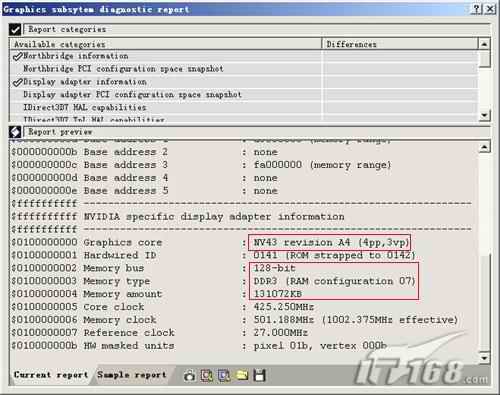 在“Graphics core”一樣,我們可以清楚地看到該卡是采用A4版本的NV43圖形核心,4pp和3vp分別是代表該核心具備4條渲染管線和3個頂點(diǎn)單元。“Memory bus”和“Memory type”分別顯示顯存的帶寬和類型,如果你不知道顯卡的顯卡是128位還是256位,顯存是DDR1、DDR2還是DDR3,甚至是DDR4,檢查這兩個測驗(yàn)結(jié)果就會一清兩楚。至于“Memory amount”就是顯存容量,131072KB換算為MB的話,就是128MB。圖中看出,該卡是自帶了128M 128位 DDR3顯存。