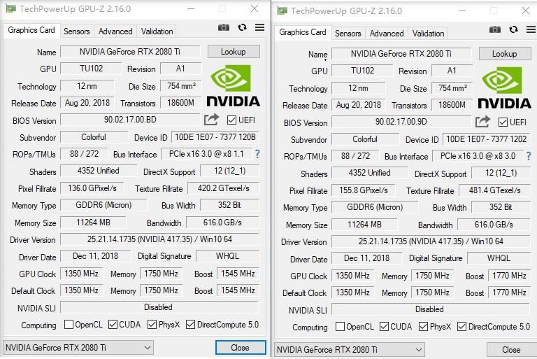 iGame RTX 2080 Ti Vulcan的GPU信息截圖,左邊的默頻BIOS頻率較低,僅有1545MHz,TDP也只有250W,比公版還要低10W。