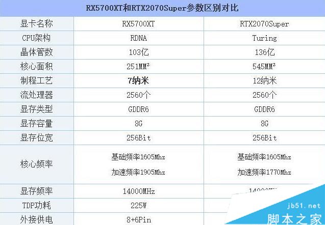 我們先來看看,RX5700XT和RTX2070 Super的參數(shù)規(guī)格對(duì)比,更好的直觀看出兩者參數(shù)的對(duì)比,如下所示。
