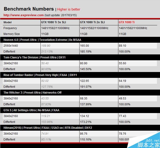測試結果表明,仍是屬于基準測試的《天堂4.0》依舊在雙路中獲得1.85X的好成績,提升幅度明顯。反觀5款游戲在GTX 1080 Ti單卡、 GTX 1080 Ti 2x SLI、GTX 1080 Ti 3x SLI表現,3x SLI由于沒有驅動支持,成績甚至不如單卡,也就是說,以目前NVIDIA的SLI策略來看,3x SLI已經沒有實際意義,最大作用就是刷刷3DMark名人堂總分榜。2x SLI表現也非常不錯,在《古墓麗影:崛起》比單卡性能提升91%之多,少的話也有DX 12模式下的《殺手6》,雙卡成績僅僅提升10%。