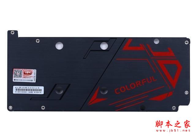 七彩虹 戰斧 GTX 1060 CS:GO Edition擁有一塊一體壓制金屬散熱背板,整體拉絲的表面具有極佳的保護性能,上面印有Colorful logo。除了保護的性能外,還擁有加速散熱與防塵掉落等特性。