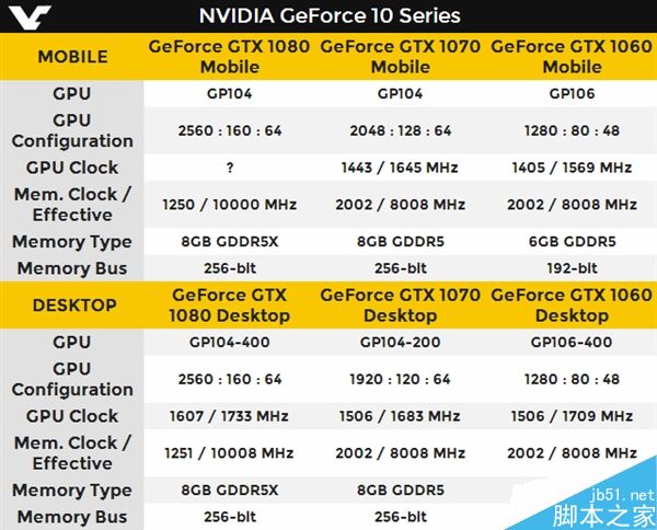 作為旗艦的GTX 1080 Mobile采用了完整的GP104核心,配備全部2560個流處理器、160個紋理單元、64個ROP單元,核心頻率未公布(當然肯定低于桌面的1607-1733MHz),而顯存也是完整的256-bit 10GHz 8GB GDDR5X。