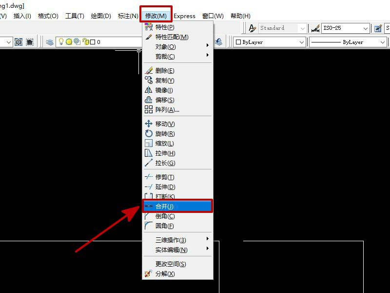 5、如果兩條線段在同一水平線上,則點擊”修改“,選擇”合并“。