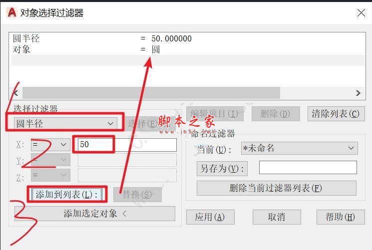 對象選擇圓半徑,值輸入50,點(diǎn)添加到列表。