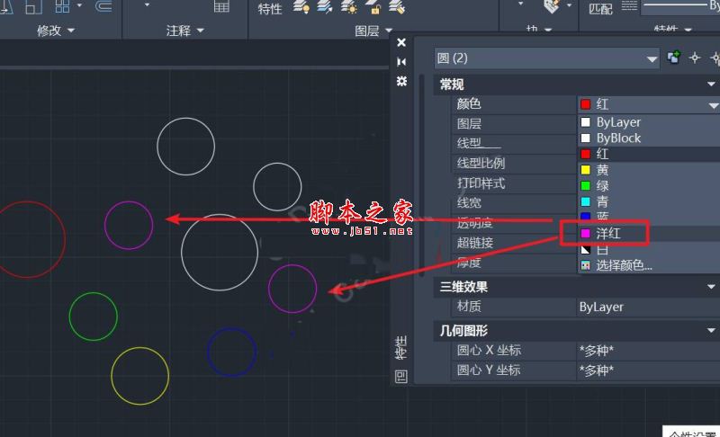 假如下圖有很多圓,半徑50、60、80等,顏色各異,這時我只想選擇半徑50,顏色為紅色的圓,我們就可以利用對象選擇過濾器。