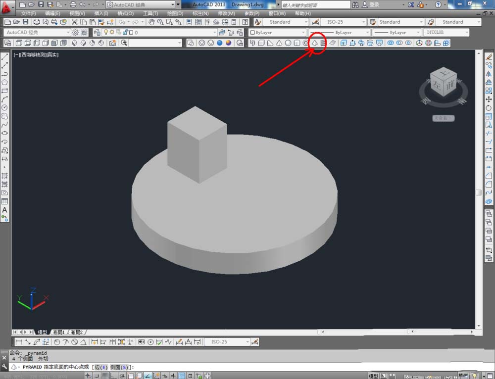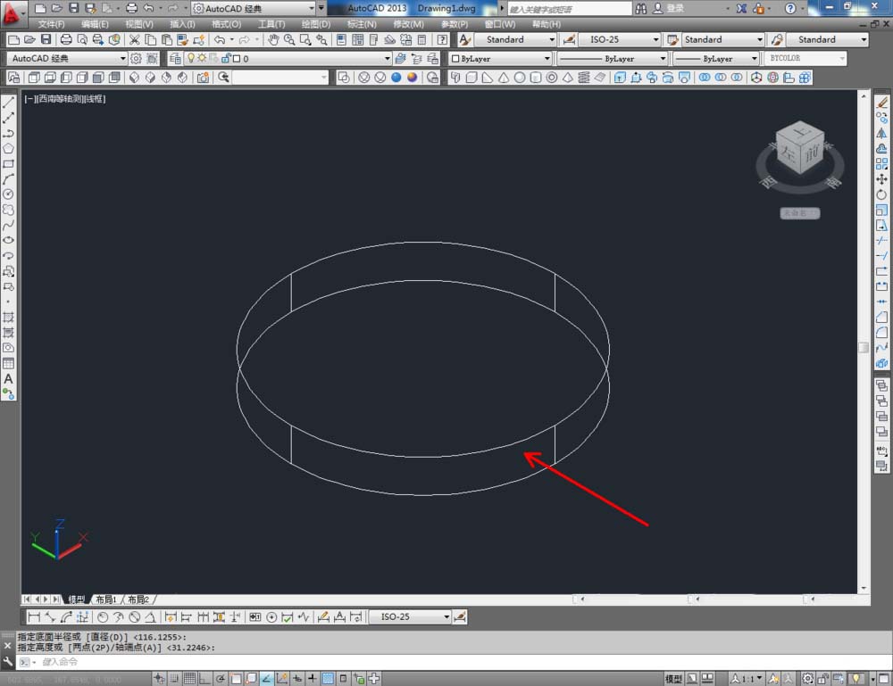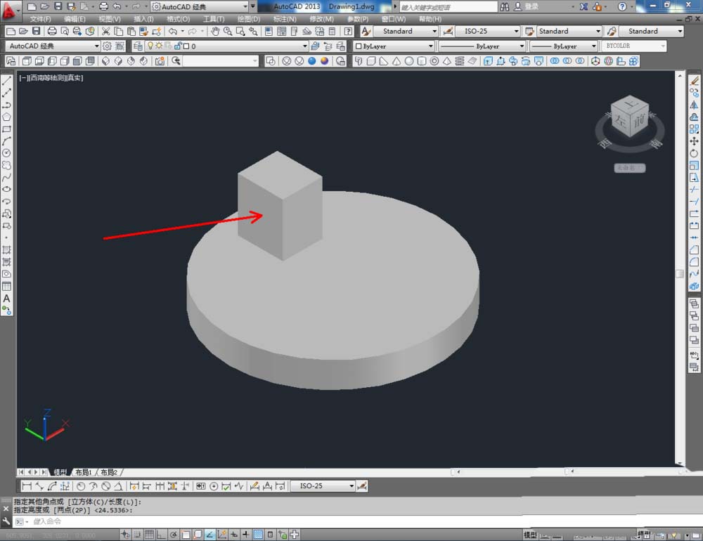 2、點擊視圖工具欄中的【西南等軸測】將視圖切換到西南視圖界面,點擊建模工具欄中的【圓柱體】工具,按圖示繪制一個圓柱體模型(如圖所示);