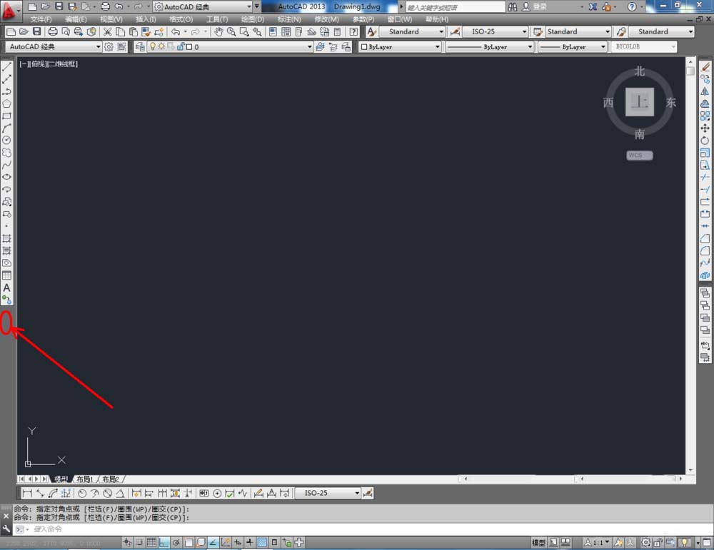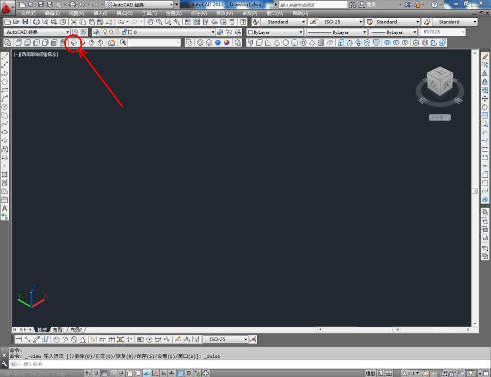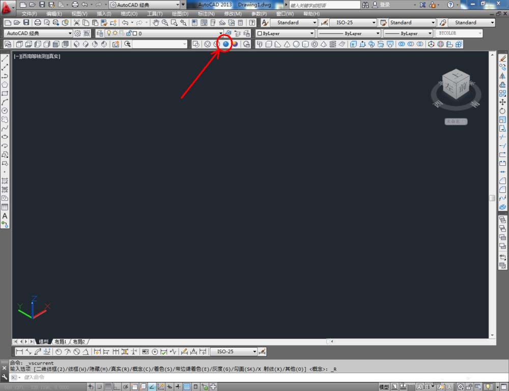 1、打開AutoCAD 2013軟件,鼠標移動到圖示區域,點擊鼠標右鍵-【AutoCAD】,勾選【建模】、【視圖】和【視覺樣式】,將這三個工具欄調出并按圖示調整好工具欄的位置;