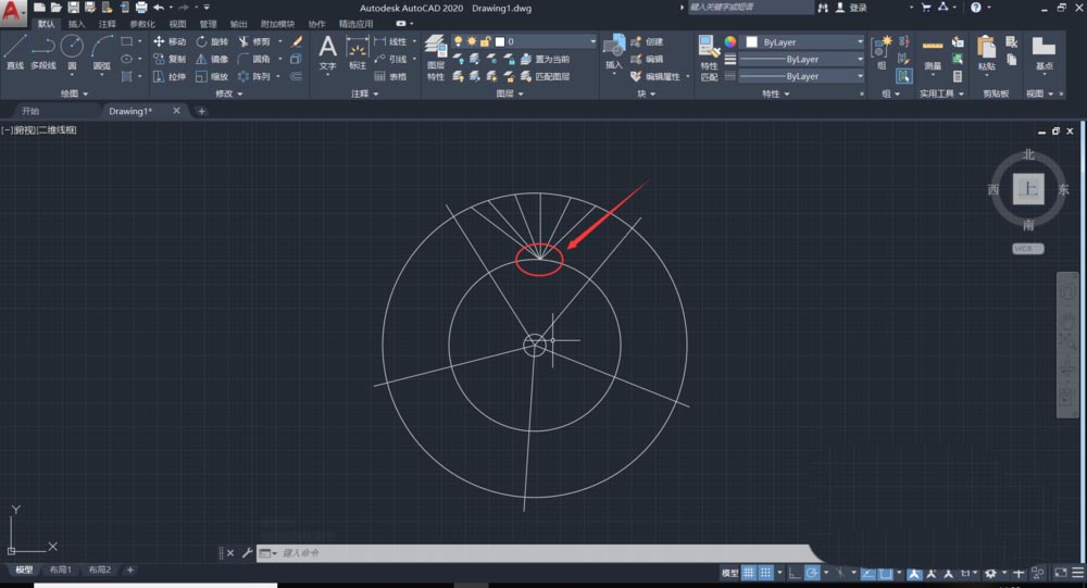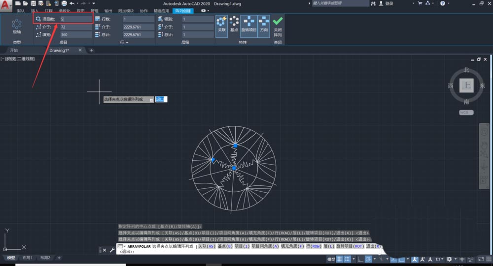 2、使用直線命令,以圓心為起點畫一條直線,在使用環形陣列將該直線以圓心為基點陣列5個,以此直線來限制桂花花瓣的繪制范圍。