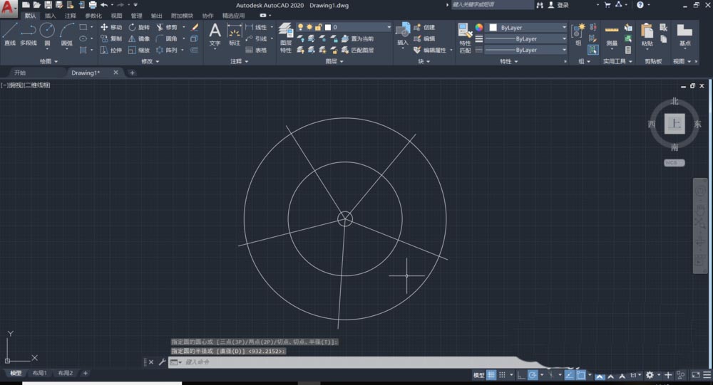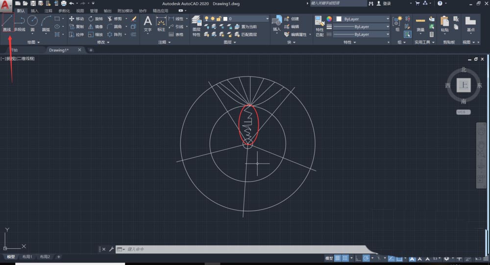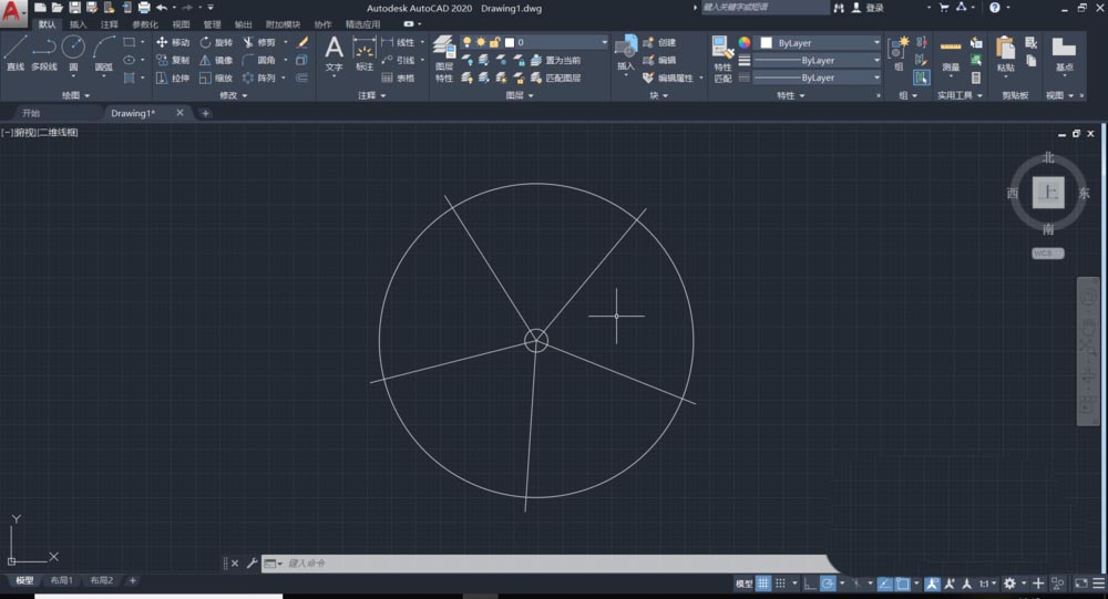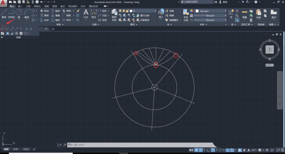 4、以中間圓為起點,使用直線命令,隨機繪制6條直線,終點落在外圓上。