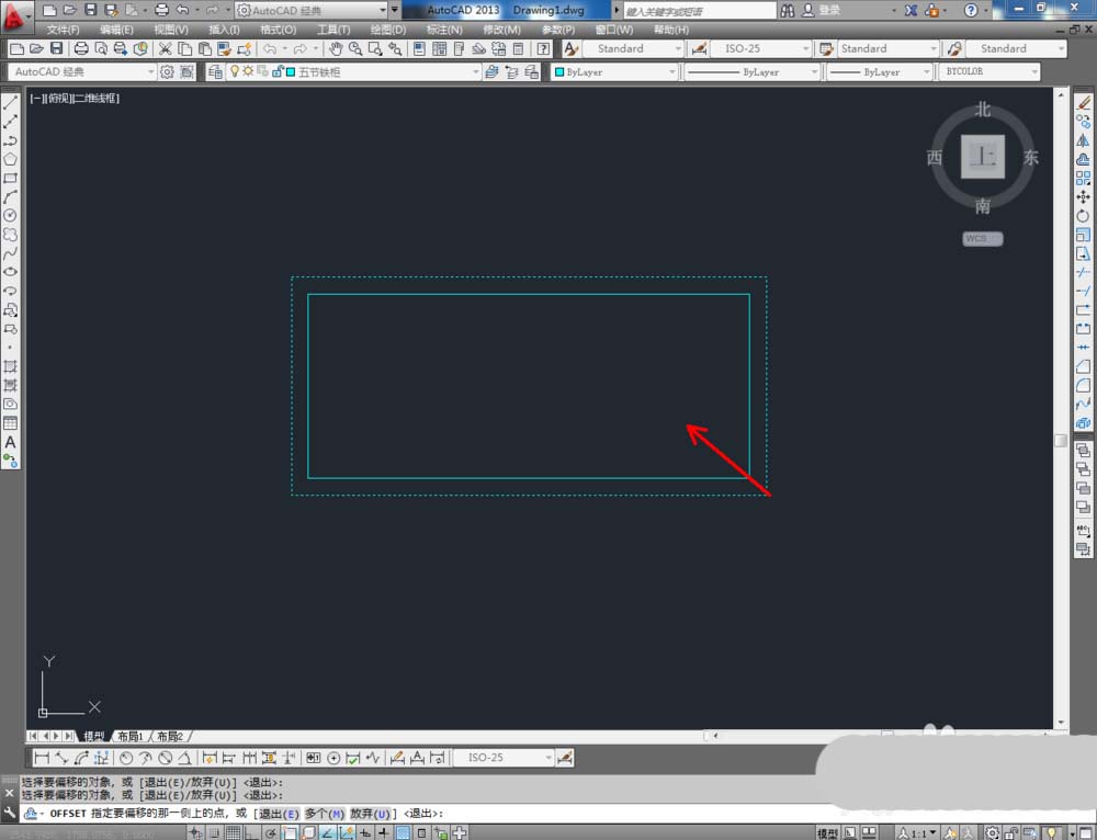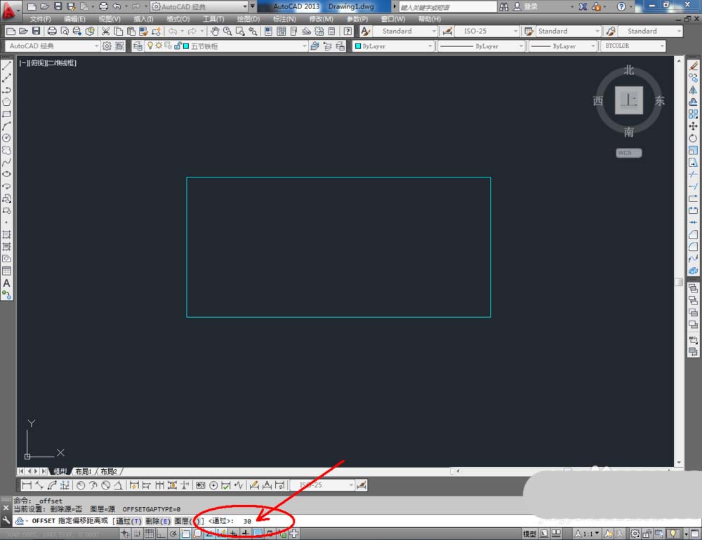 3、點擊右邊工具欄中的【偏移】,在命令欄中輸入: 30,對矩形圖案進行向內偏移 。點擊【直線工具】在圖示位置繪制一條直線線段(如圖所示);