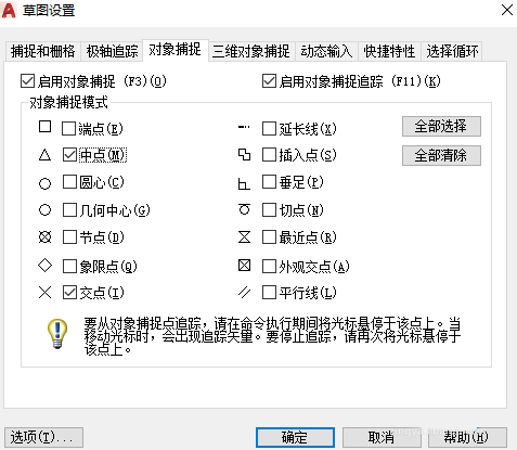 4、點(diǎn)擊對(duì)象捕捉,選擇中點(diǎn)