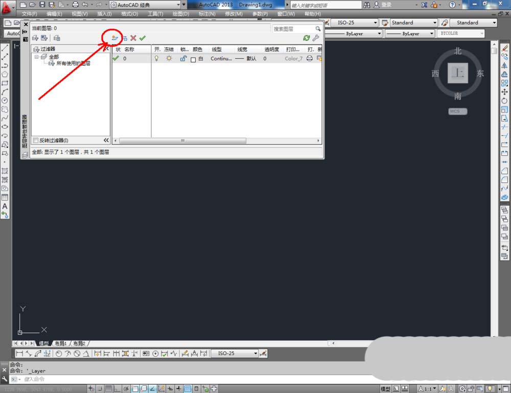 1、打開AutoCAD 2013軟件,點擊【圖層特性管理器】,點擊【新建圖層】,將圖層命名為:層柜。點擊色塊,按圖示設置一個圖層顏色,完成層柜圖層的設置(如圖所示);