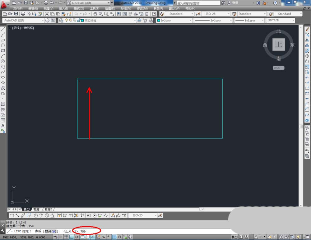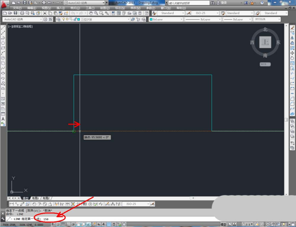 3、點擊【直線工具】,從距離端點150mm的位置開始,按圖示在命令欄中依次輸入數值,繪制矩形圖案內部的三條直線(如圖所示);